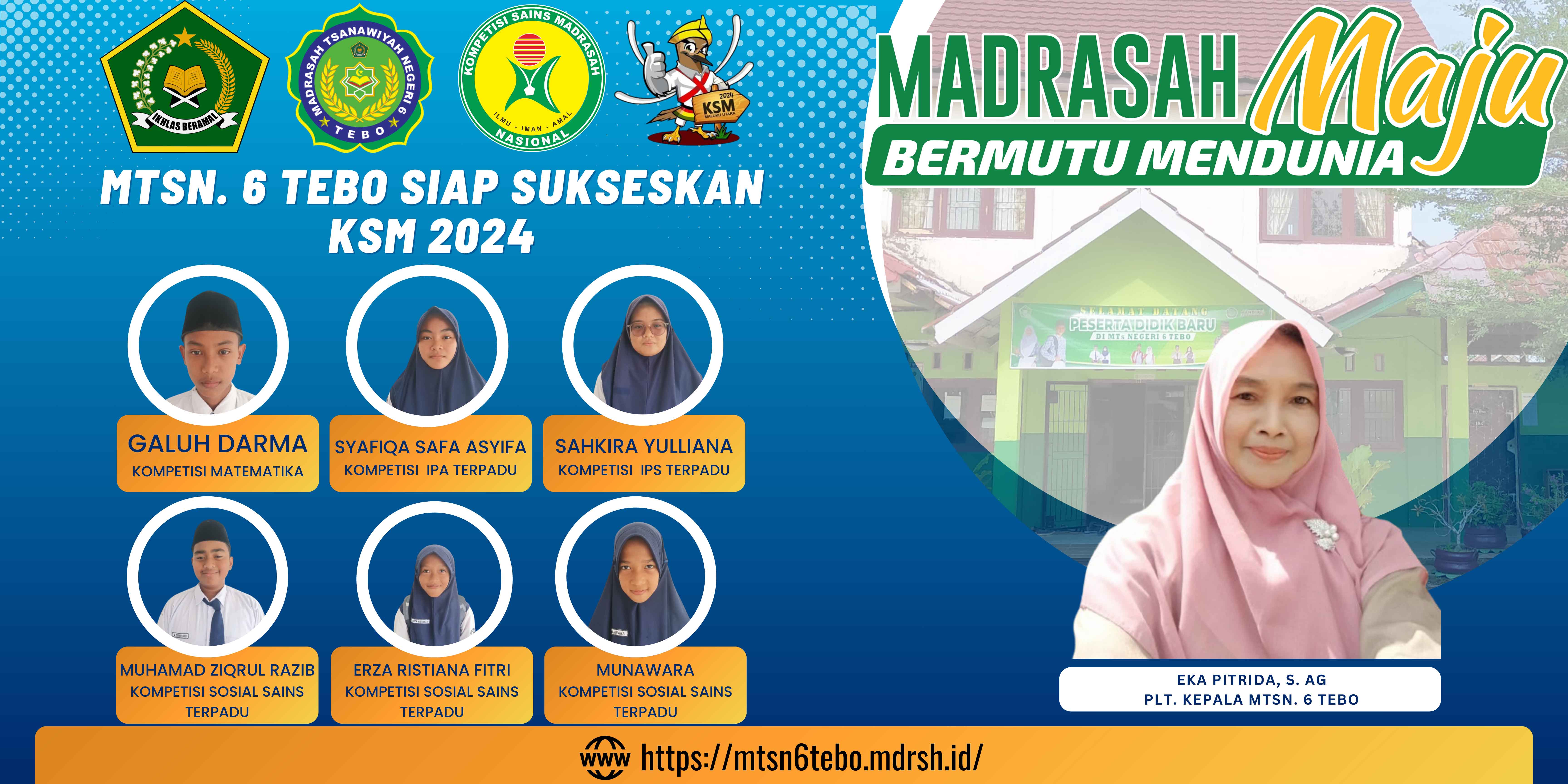 Tebo Ilir (MTsN. 6 Tebo), Sebanyak 6 Orang Siswa/i Madrasah Tsanawiyah Negeri 6 Tebo Mengikuti Kegiatan Kompetisi Sains Madrasah (KSM) Tahun 2024 Kabupaten Tebo. Adapun peserta KSM tersebut terdiri dari Peserta Individu, Galuh Darma Mengikuti Kompetisi Matematika, Sahkira Yulliana Mengikuti Kompetisi IPS Terpadu, Syafiqa Safa Asyifa Mengikuti Kompetisi Ipa Terpadu. Sedangkan untuk Peserta Beregu : Muhamad Ziqrul Razib, Munawara, dan Erza Ristiana Fitri, mengikuti Kompetisi Sosial Sains terpadu (Matematika, IPA, dan IPS).