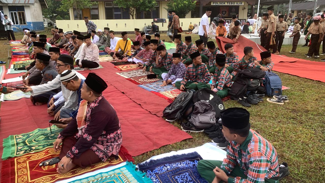 Tebo Ilir (MTsN 6 Tebo) Sebanyak 40 siswa/i MTsN 6 Tebo mengikuti Sholat Istisqa di Halaman Mapolsek Tebo Ilir pada hari Kamis (01/08/2024). Kegiatan ini dipandu oleh guru pendamping Bapak Suherman, S. Pd. I, Bapak Sepriyansyah, S. Hum, dan Ibu Fatimah S. Pd. I. Acara ini dilaksanakan berdasarkan edaran dari Pemerintah Kecamatan Tebo Ilir yang mengimbau masyarakat untuk melaksanakan Sholat Istisqa guna memohon turunnya hujan.