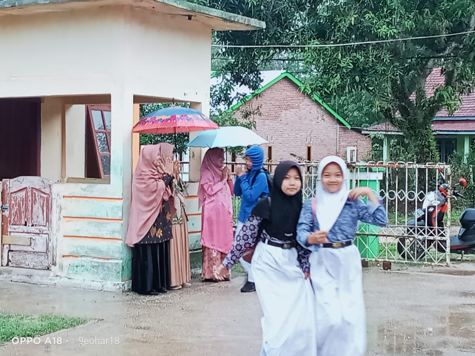 Ibu Sarmi, S. Pd., Ibu Fatimah, S. Pd. I., Ibu Hesti Mulati Sasmita Sari, S. Si., dan Bapak Sepriyansyah, S. Hum. adalah para guru yang bertugas sebagai piket pada hari itu. Dengan payung di tangan, mereka tetap menyambut siswa/i yang datang satu per satu di gerbang madrasah, memastikan setiap anak merasa diperhatikan dan disambut hangat meskipun cuaca kurang bersahabat. Senyuman tak lepas dari wajah mereka, menciptakan suasana yang penuh kehangatan di tengah guyuran hujan.